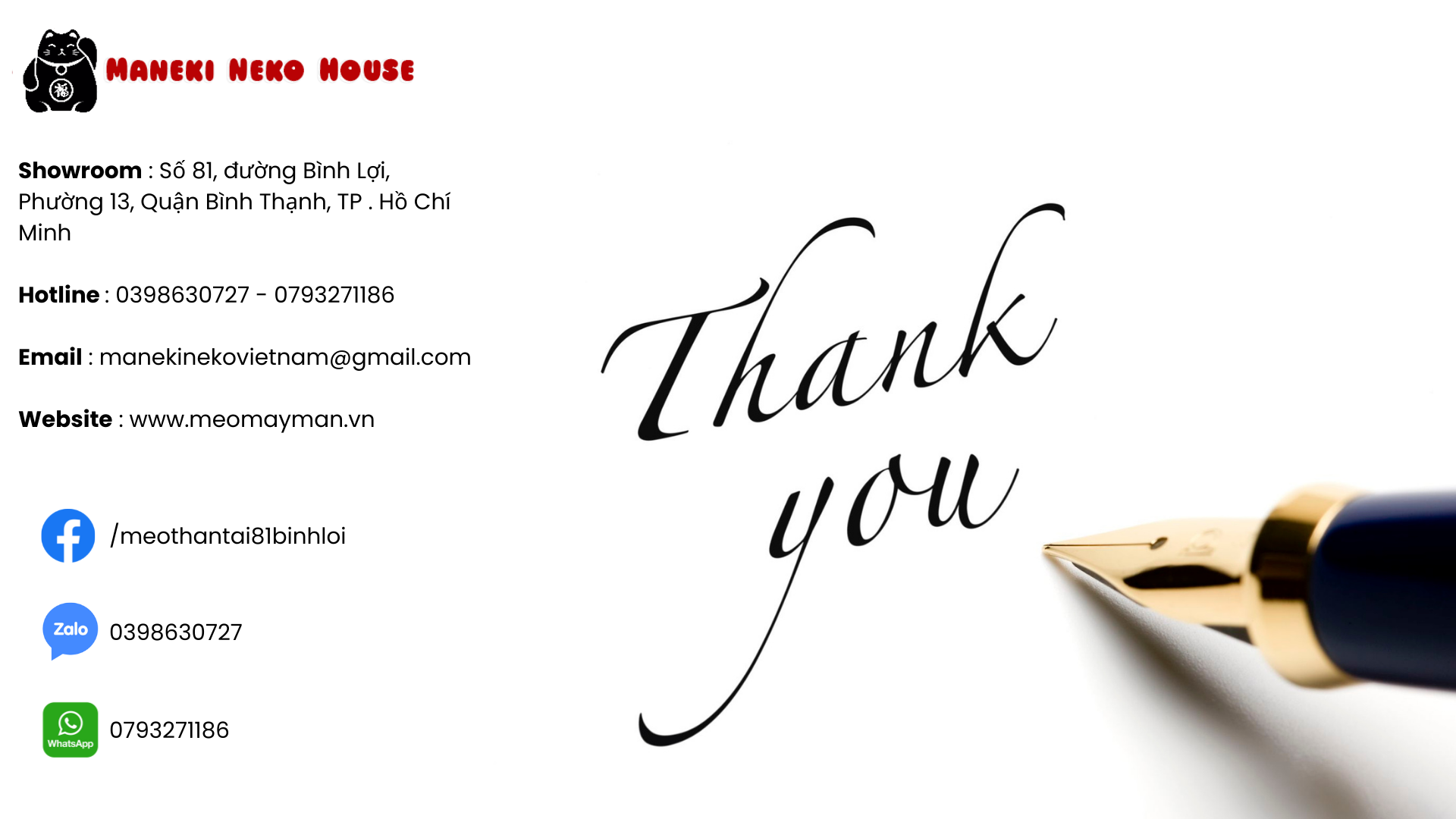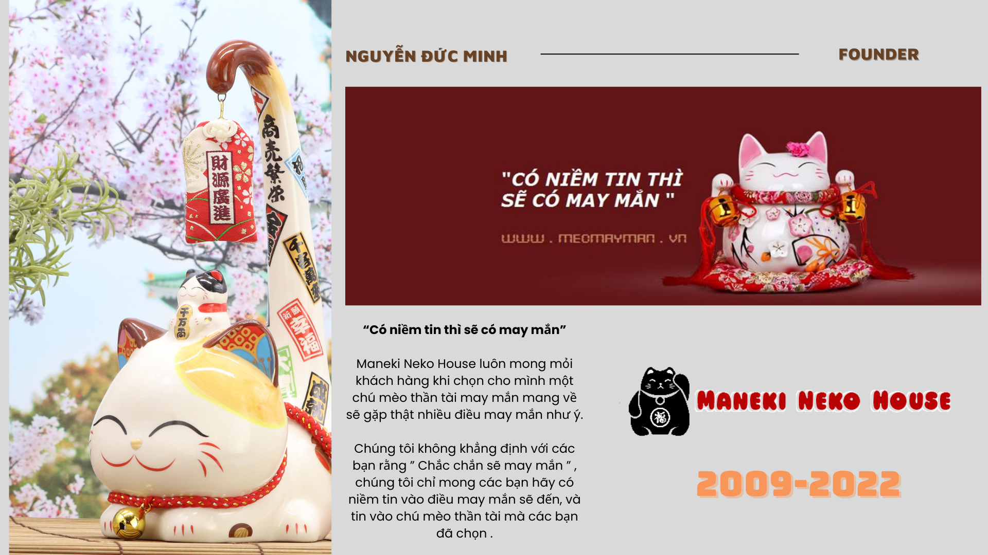 Công ty TNHH SX TM DV ĐỨC KHẢI tiền thân là Hộ Kinh doanh Maneki Neko House, được thành lập 2014 chuyên sản xuất, phân phối các mặt hàng quà tặng phong thủy đa văn hóa. Sau nhiều năm hoạt động, Quà Tặng ĐỨC KHẢI mở rộng quy mô, trở thành đơn vị chuyên sản xuất và phân phối các sản phẩm quà tặng phong thủy uy tín chất lượng hàng đầu Việt Nam hiện nay. .