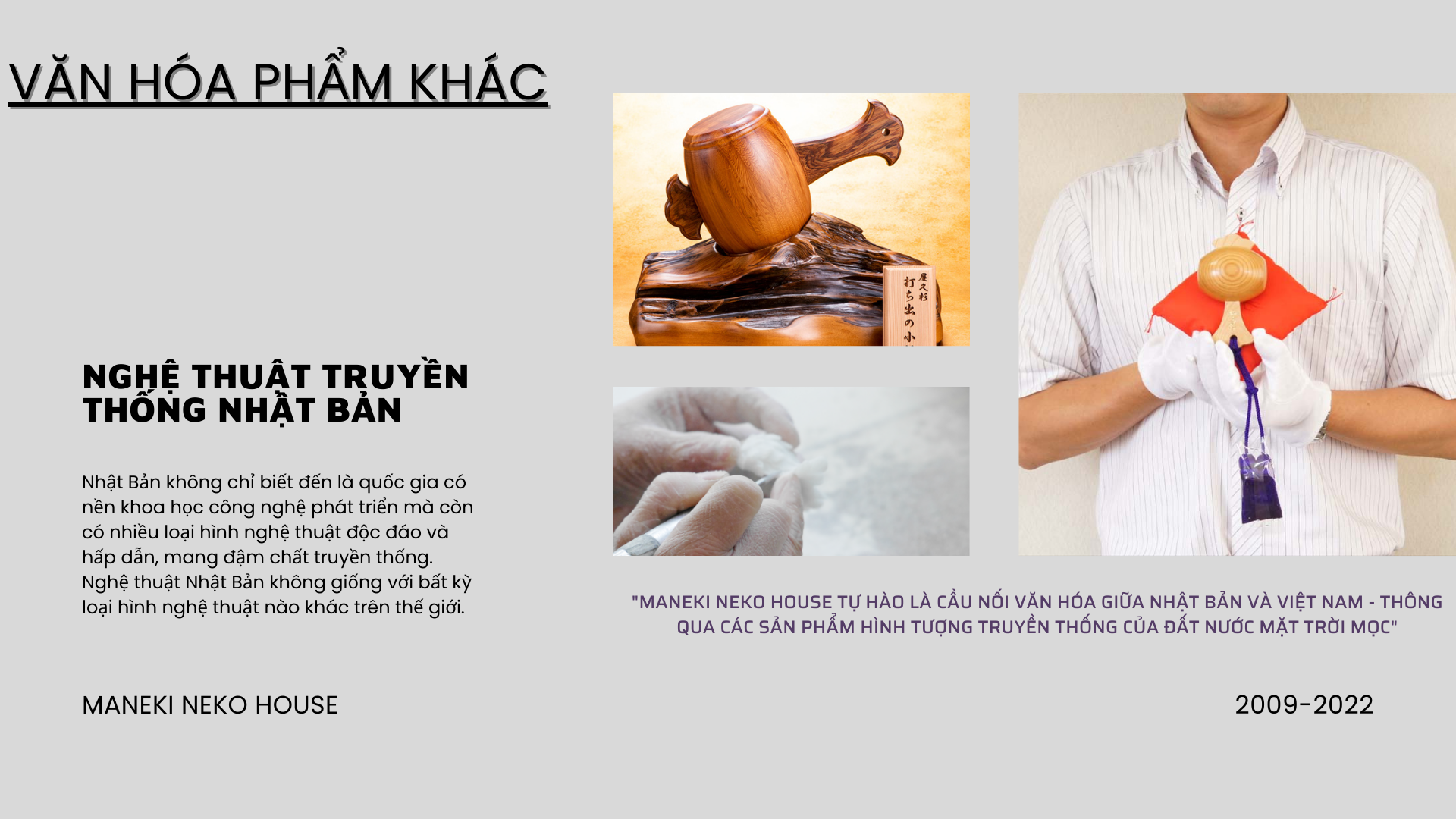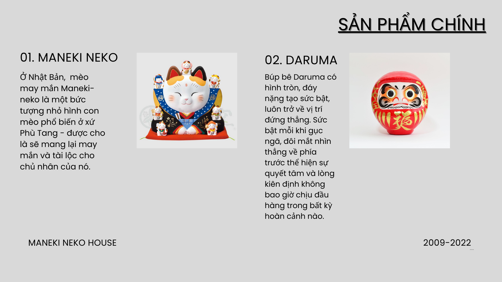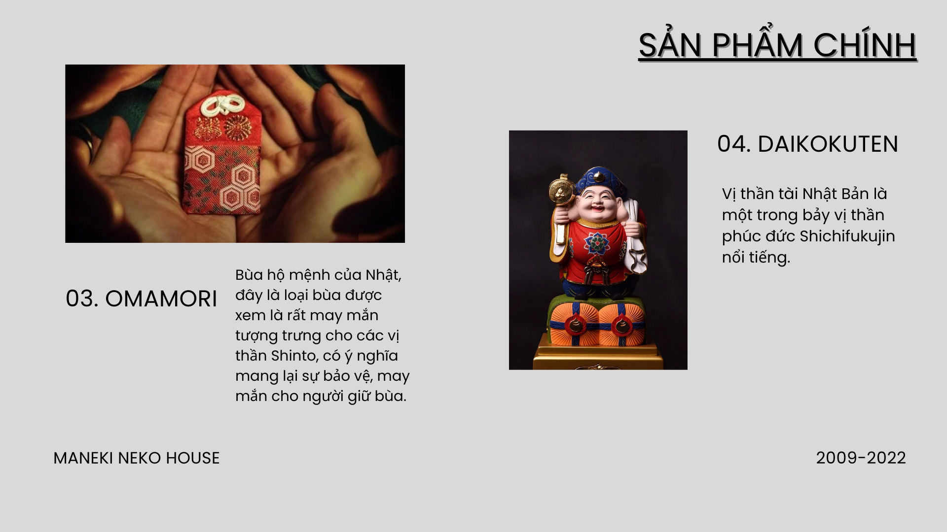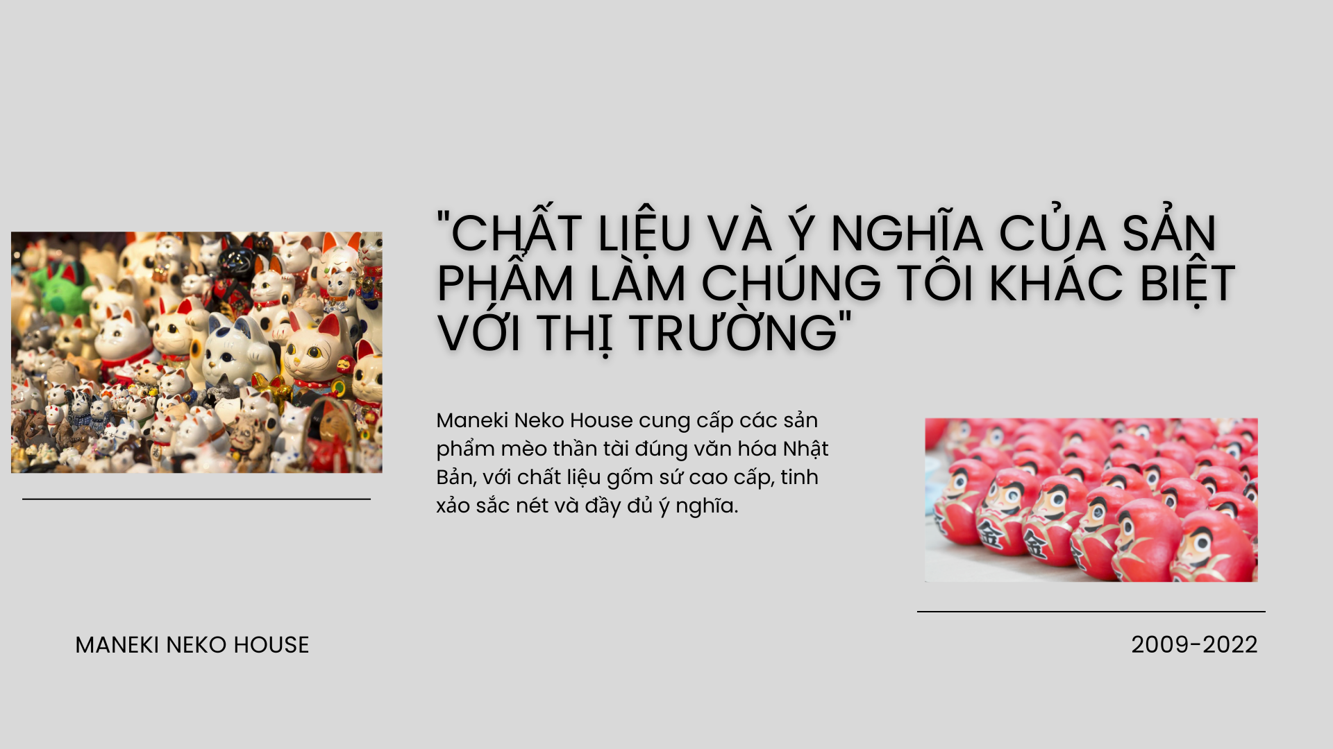 Với mục đích phổ biến và quảng bá văn hóa Nhật bản , cụ thể là các loại vật dụng, quà tặng , quà lưu niệm, trang trí phong thủy liên quan đến các biểu tượng may mắn của đất nước hoa anh đào , chúng tôi đã và đang nỗ lực hết mình để cung cấp và phát triển các sản phẩm rộng rãi đến với người tiêu dùng và các cửa hàng kinh doanh có nhu cầu .Tính đến tháng 1 năm 2024, Đức Khải Gift đã cung cấp cho thị trường Việt Nam hơn 10.000 sản phẩm mèo thần tài may mắn Maneki Neko và gần 15.000 mặt hàng quà lưu niệm nhỏ liên quan đến các linh vật Nhật Bản như Daruma , Shichifukujin ( 7 vị thần Phúc Đức ) , các vật phẩm may mắn Nhật Bản như quạt giấy Uchiwa , Búa Uchide No Kozuchi , Cá chép Koi ,Thuyền Takarabune..v..v. với giá rẻ nhất , chất lượng và chế độ bảo hành luôn vượt trội so với các sản phẩm cùng loại trên thị trường.