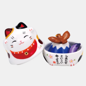 Mèo thần tài Yakushigama được cho là mang đến sự bảo vệ linh thiêng của Yakushi Nyorai cho những người ốm yếu về sức khỏe, kèm với các vật phẩm may mắn chiêu tài đặc trưng của Nhật Bản như búa Uchide Ko Nozuchi, hoa đào Sakura, thuyền châu báu Takarabune, Thất Phúc Thần Shichifukujin, đồng xu Koban…